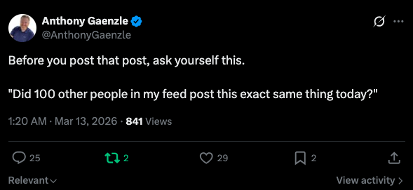 They copy writing templates, mimic posting styles, or follow formulas they’ve been told will guarantee growth. The problem is that when everyone uses the same templates, the content starts to feel interchangeable.