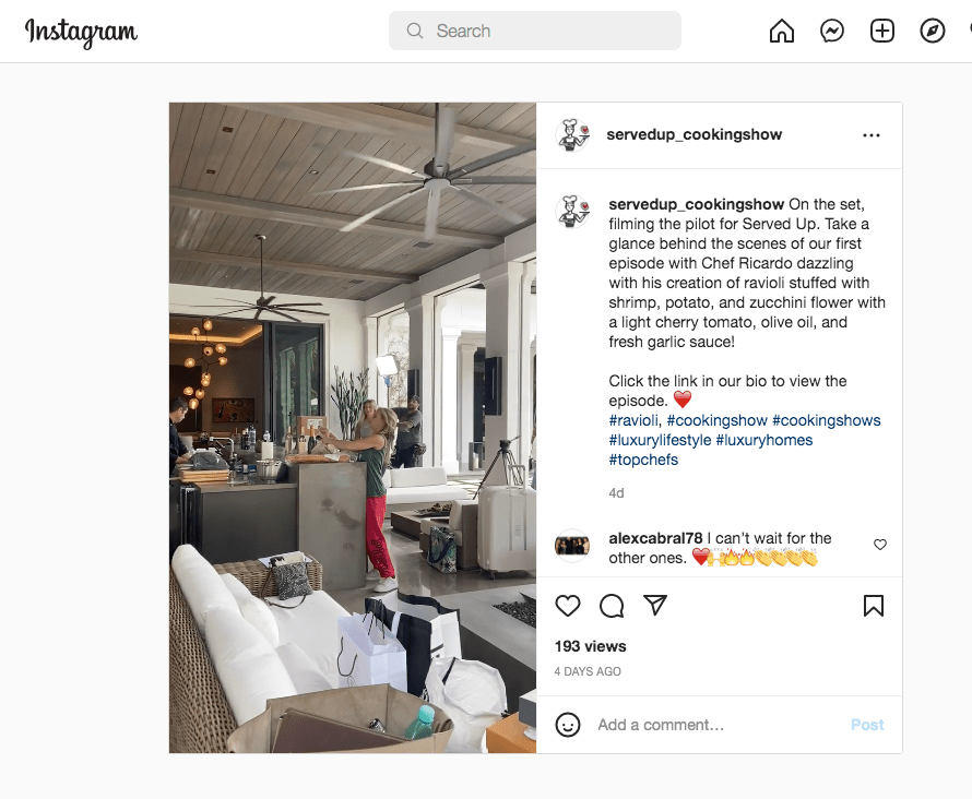 Below, we’ll highlight a variety of types of content themes or pillars you can share. One that we’ll note is the behind-the-scenes pillar. This is an example from Served Up, a new cooking show that features luxury homes and some of the top chefs in the world.